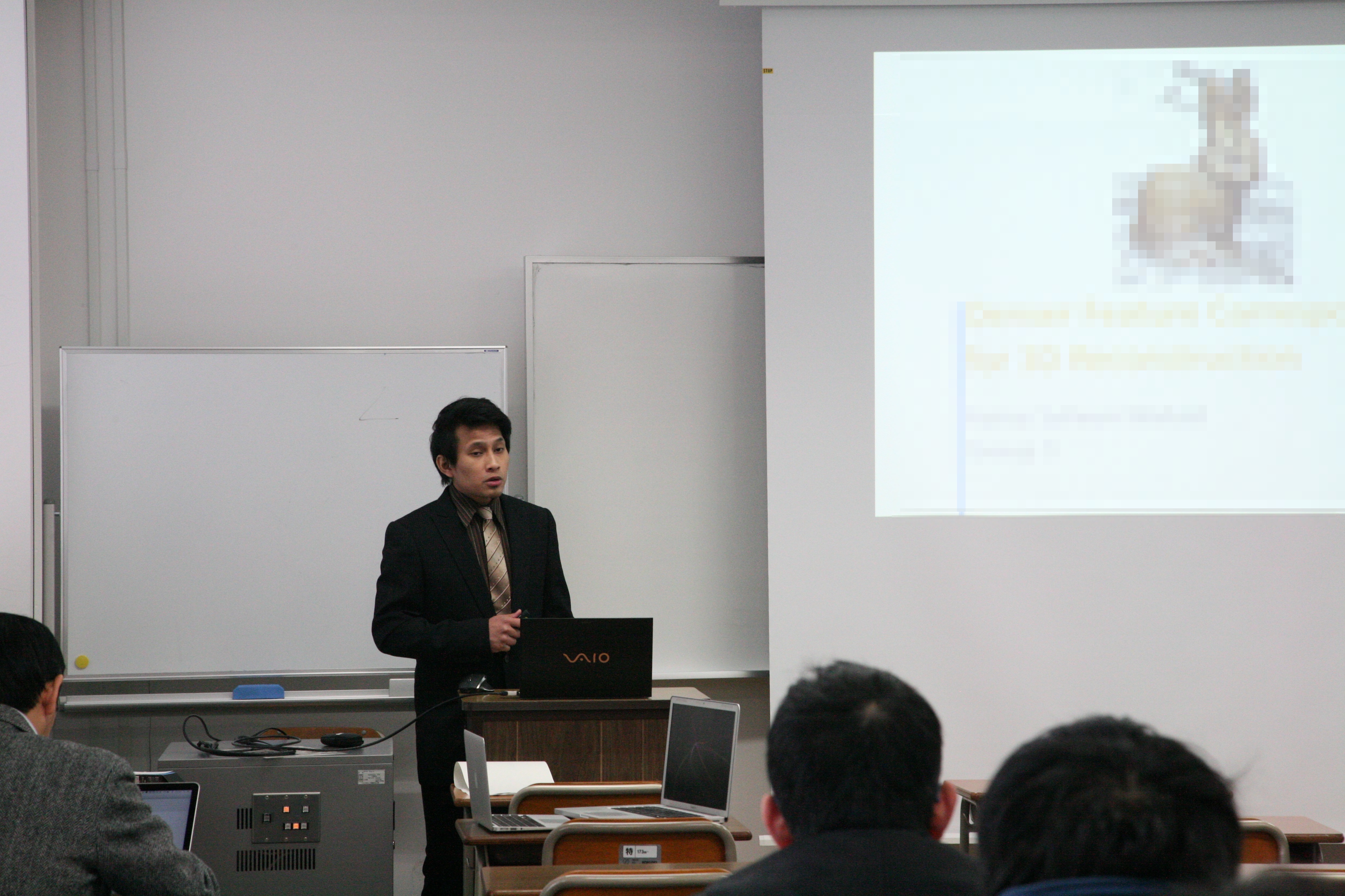 工学研究科 知能情報工学分野の修士論文発表会が行われ、田中くん,小熊くん,石丸くん,志賀くん,森くん,北野くん,宮田くん,Safwanくんが、発表しました。